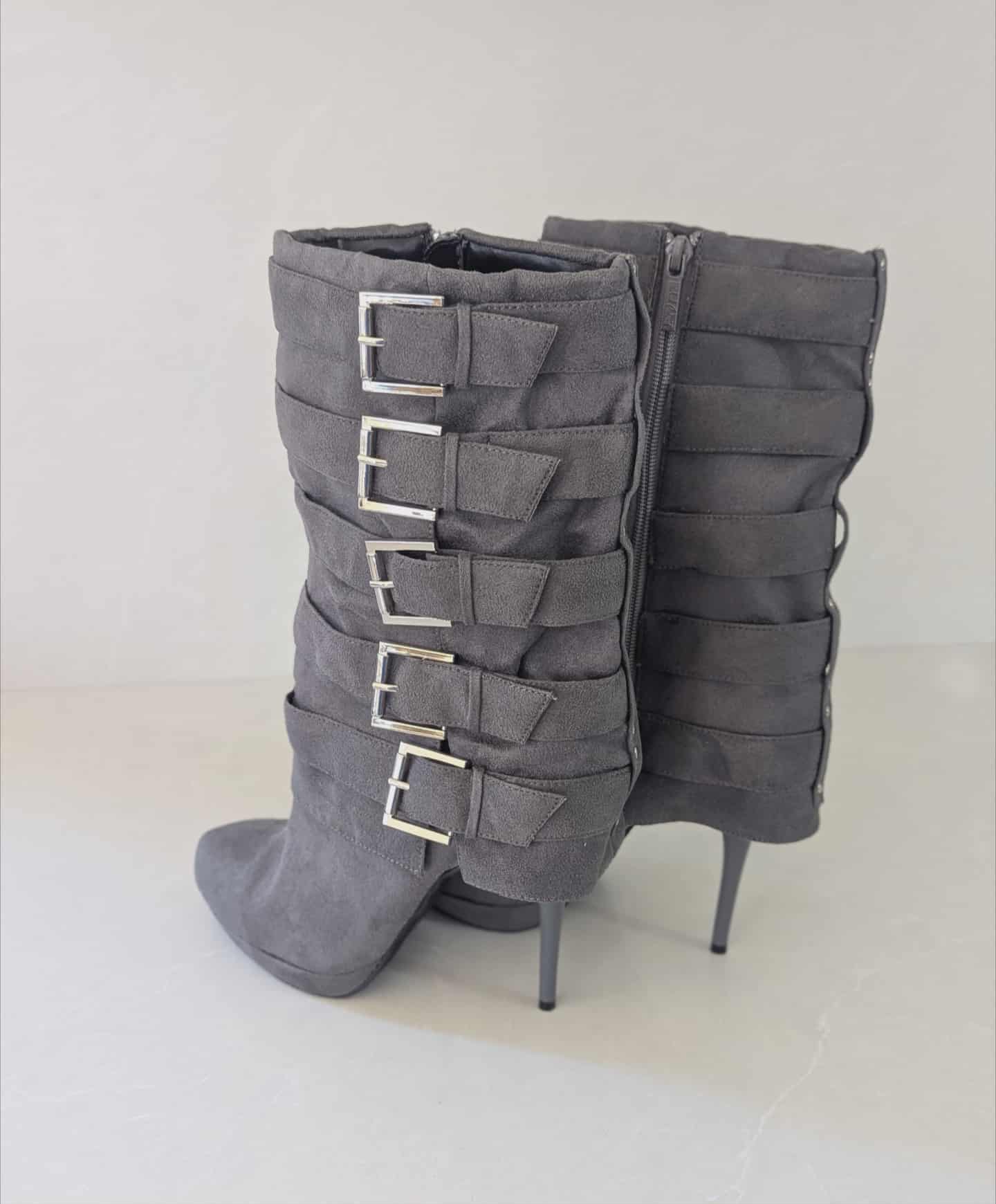 Turn heads with these brand-new gray suede high heel boots. Designed with five bold silver buckles and a sleek stiletto heel, they bring instant edge and confidence to any look. Perfect with jeans, dresses, or skirts — stylish, sturdy, and affordable.